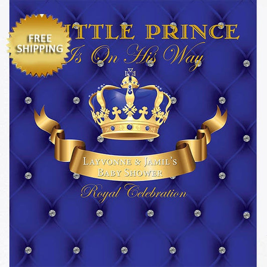 Blue and gold royal prince baby shower and birthday step and repeat backdrop