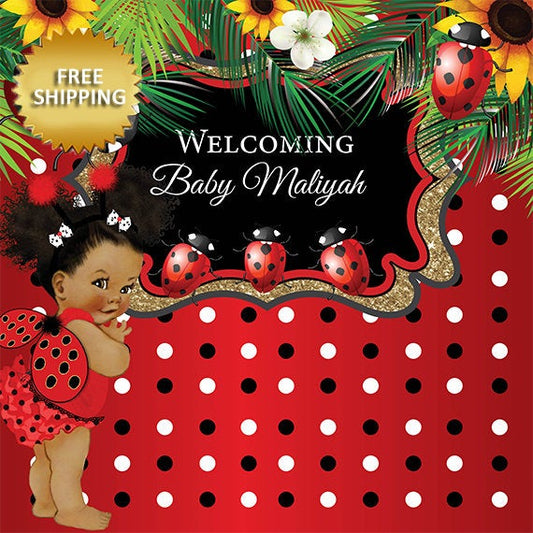 Ladybug Polkadots Baby Shower Step and Repeat backdrop with African American baby