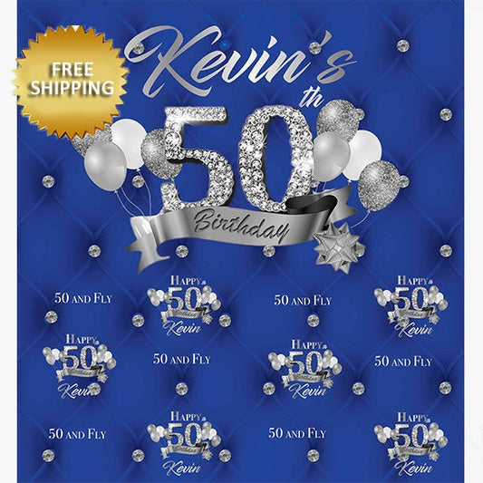 Blue and Silver 50th Birthday Party Custom Step and Repeat Tufted Backdrop