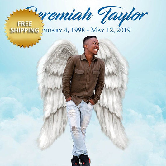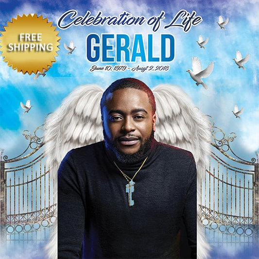 Heaven Sent Gated Winged Memorial Step and Repeat backdrop with photo