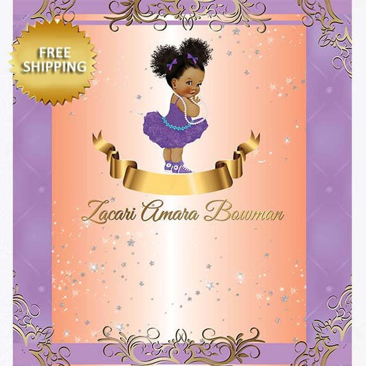 Royalty Black Baby Girl Theme Baby Shower Photo Backdrop - Purple and Gold