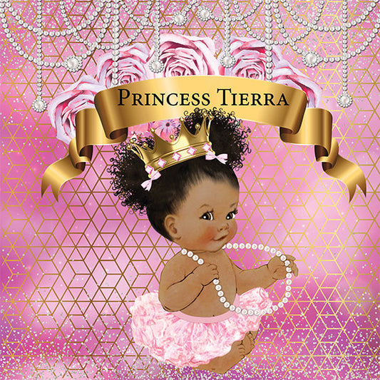 Princess with Pearls Baby Shower step and repeat backdrop with African American baby