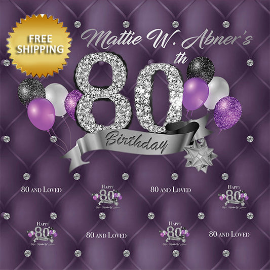 Purple and Silver Step and Repeat backdrop for 50th Birthday Party